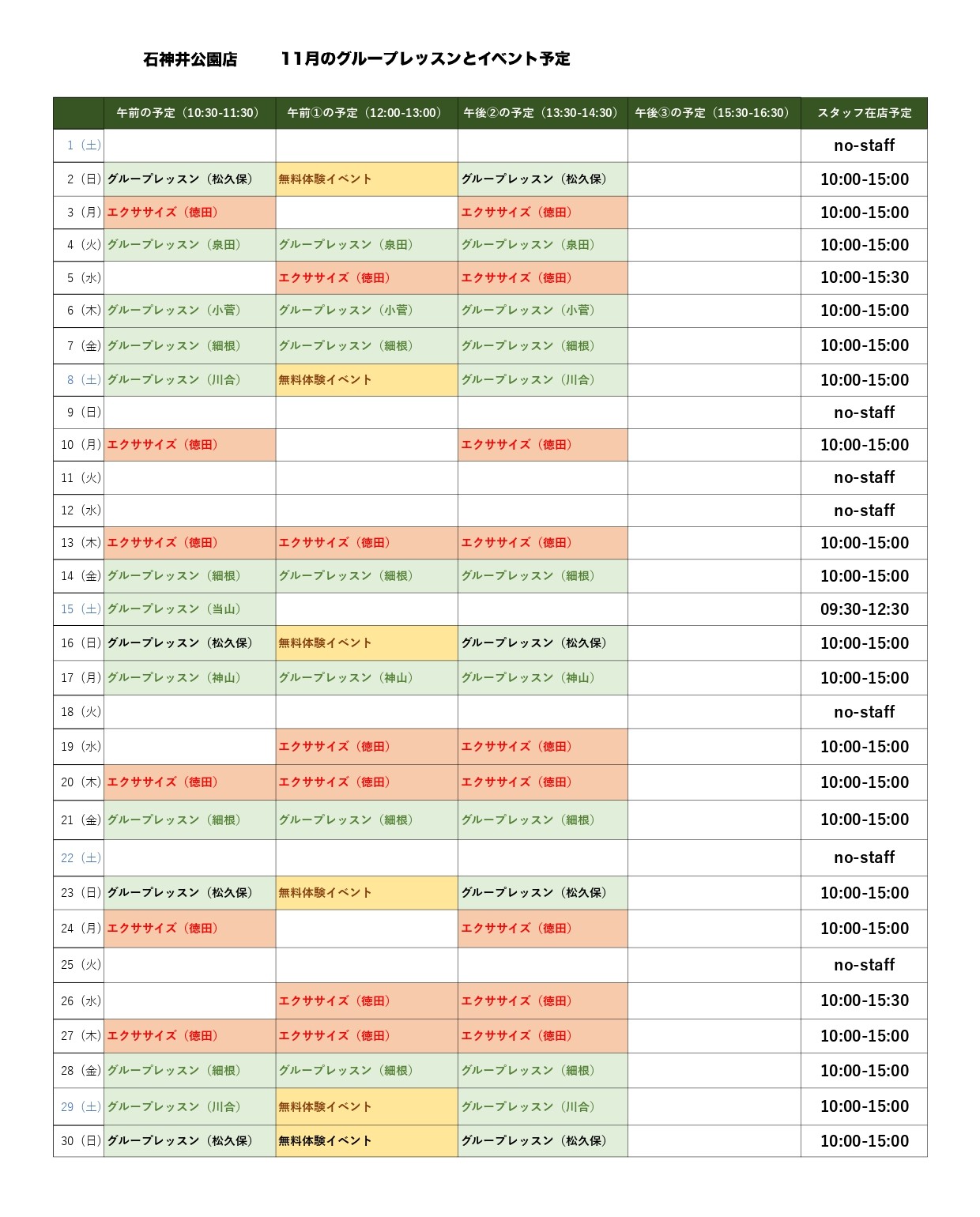 「石神井公園店」で日中に開催しているグループレッスン、2025年11月の日程のご案内です。