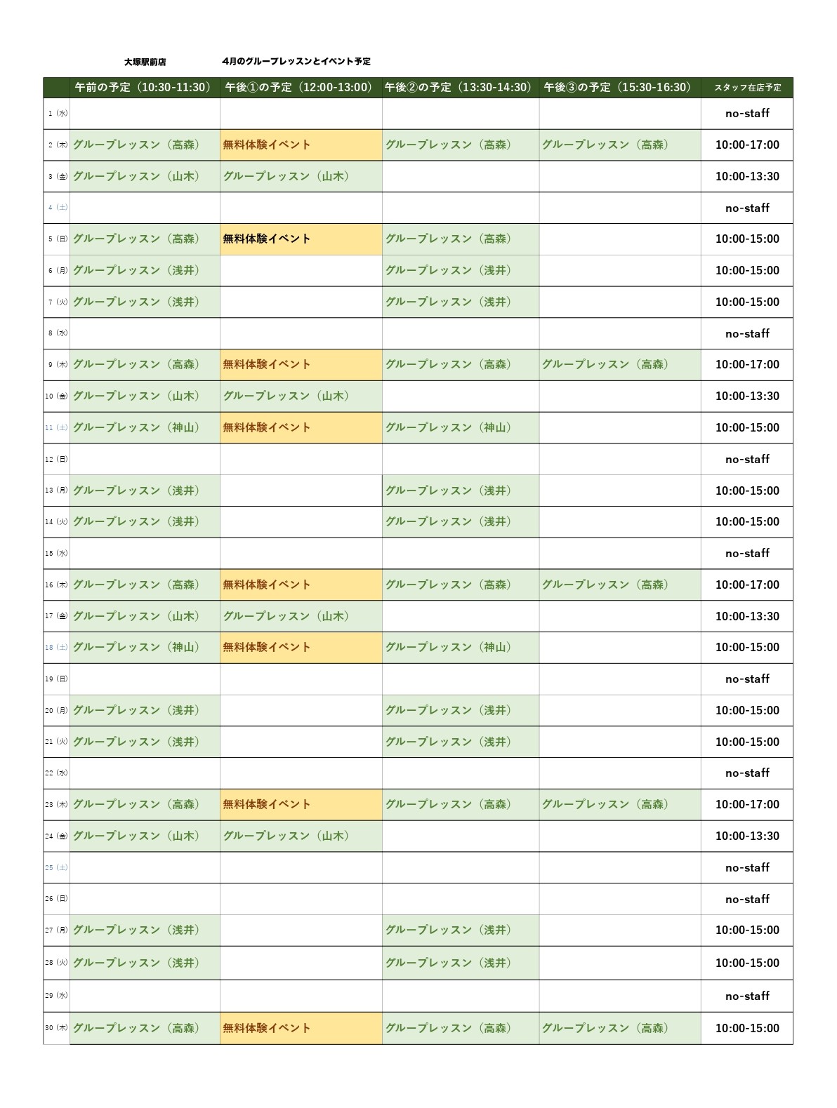 「大塚駅前店」で日中に開催しているグループレッスン、2026年4月の日程のご案内です。