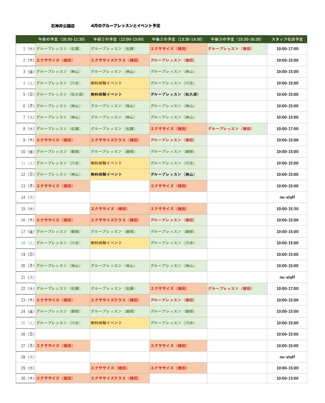 4月のエクササイズクラス開講予定(石神井公園店)