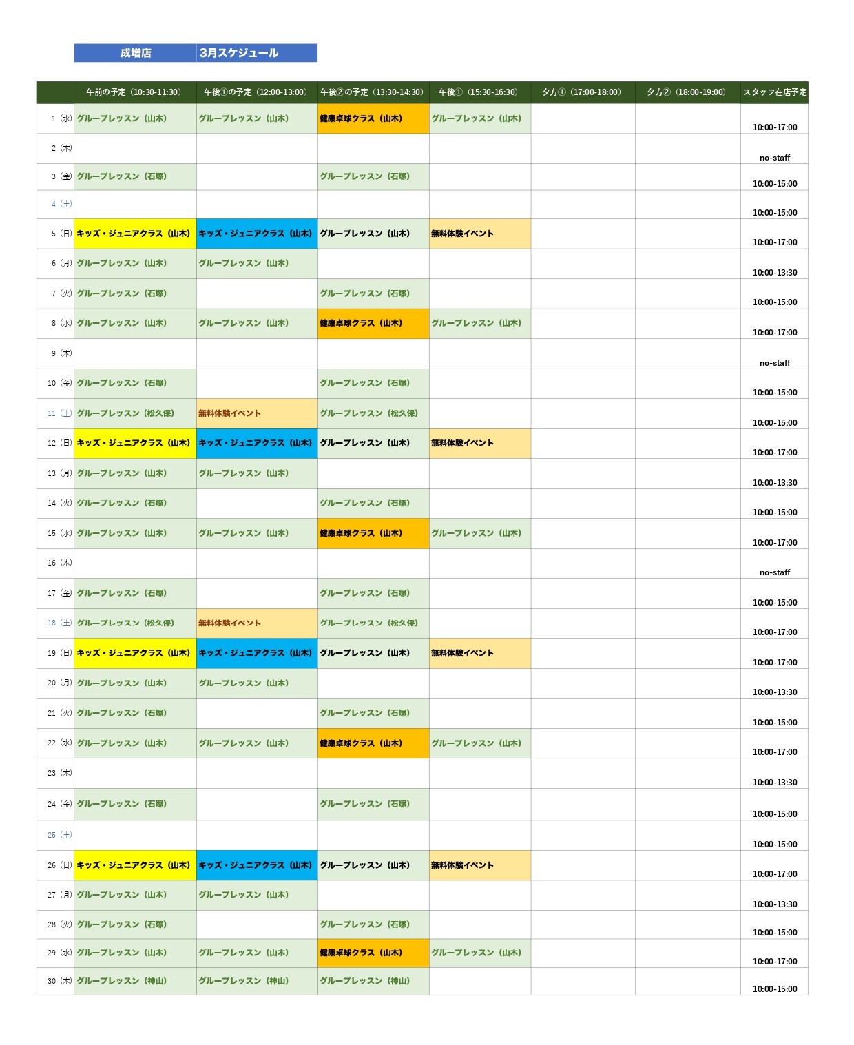 「成増店」で日中に開催しているグループレッスン、2026年4月の日程のご案内です。