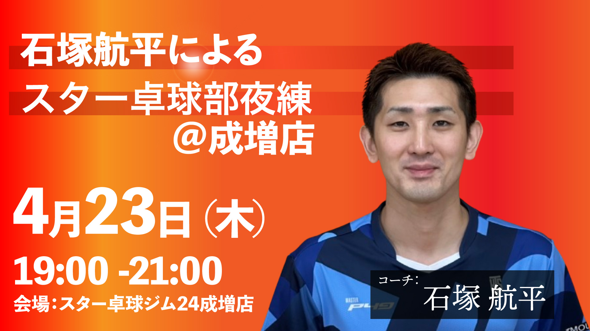 2026年4月23日(木)19:00-21:00 石塚航平による「スター卓球部夜練@成増」の開催!
