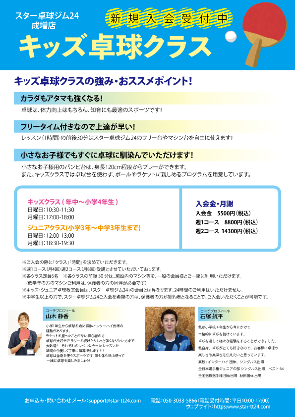 ※キッズ・ジュニア卓球教室会員は、「スター卓球ジム24」の会員とは異なります。24時間のご利用はいただけません。