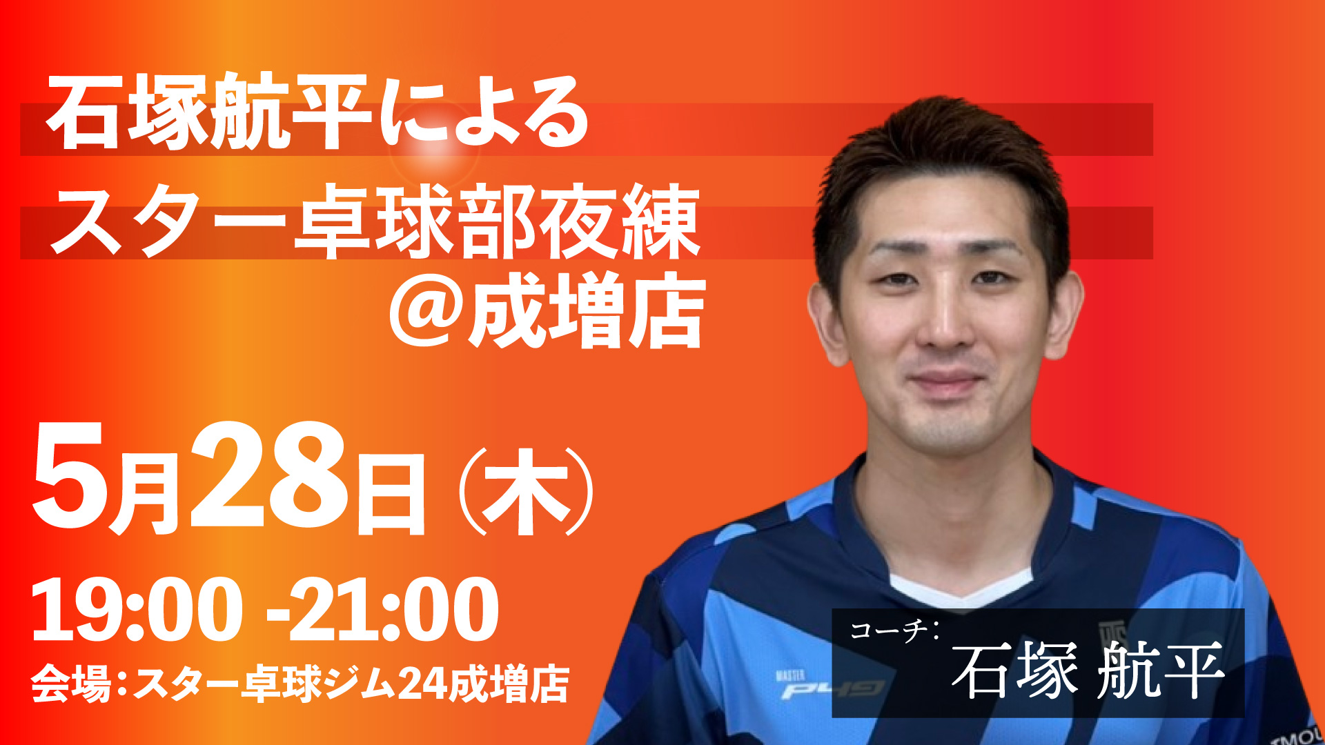 2026年5月28日(木)19:00-21:00 石塚航平による「スター卓球部ゲーム練@成増」の開催のご案内を申し上げます。