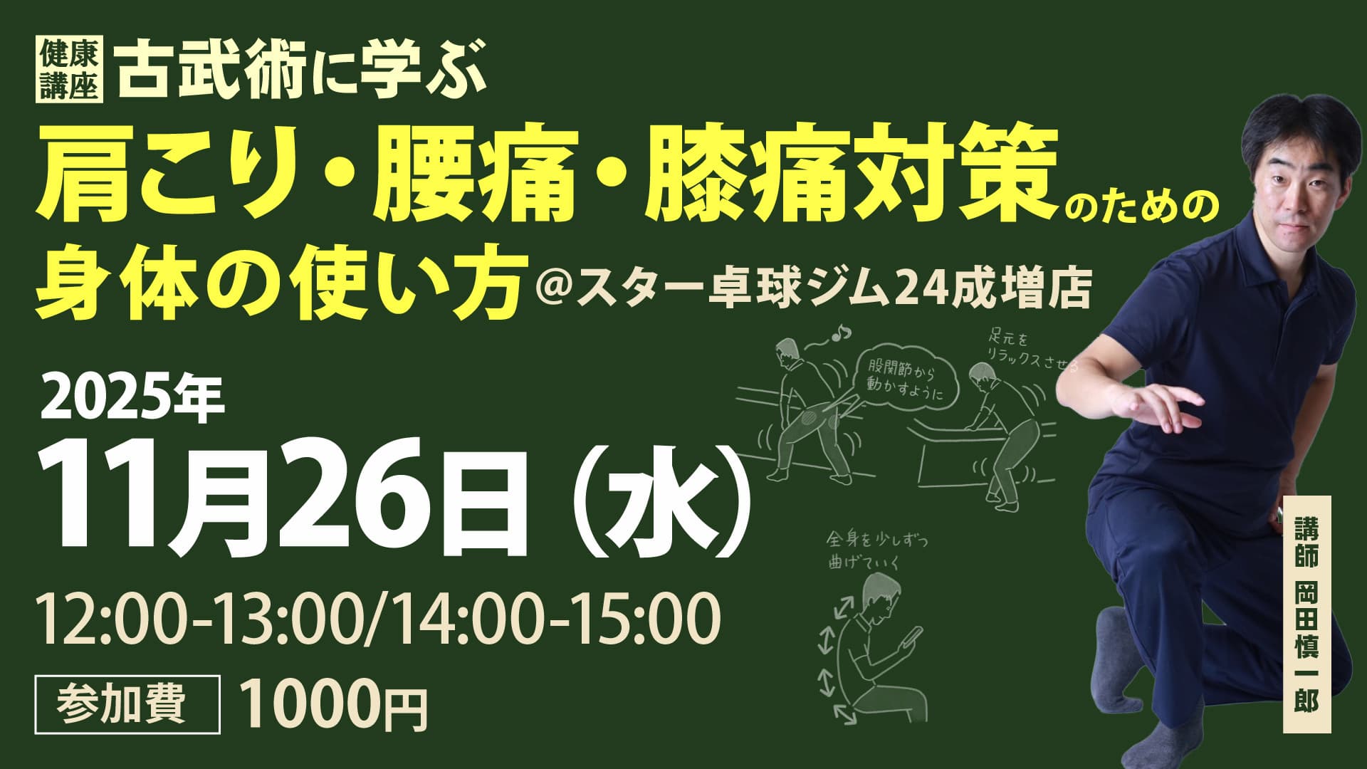 この講座では、日本古来より伝わる武術の身体運用にヒントを得た、腰痛、膝痛、肩こりを解消し、予防する身体の使い方や、日常生活動作の見直しをお伝えします。