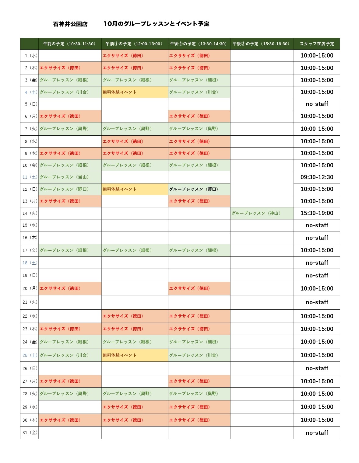グループレッスン予定(石神井公園店)